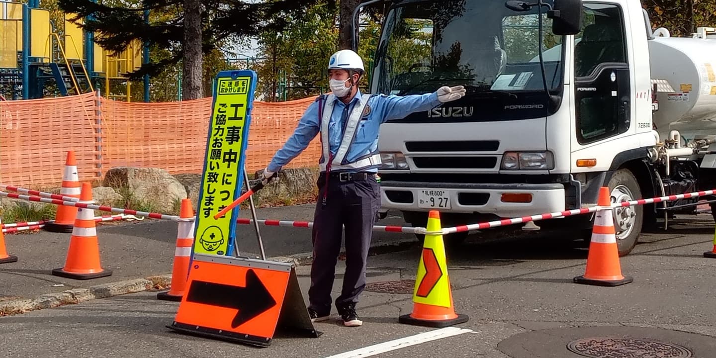 電気通信工事・道路工事・ガス工事・水道工事…などあらゆる道路に関係する工事や建築現場において、交通誘導業務を実施し、通行人や通行車両、そして作業員達の生命・身体・財産を守るため日夜現場の安全に努めています。